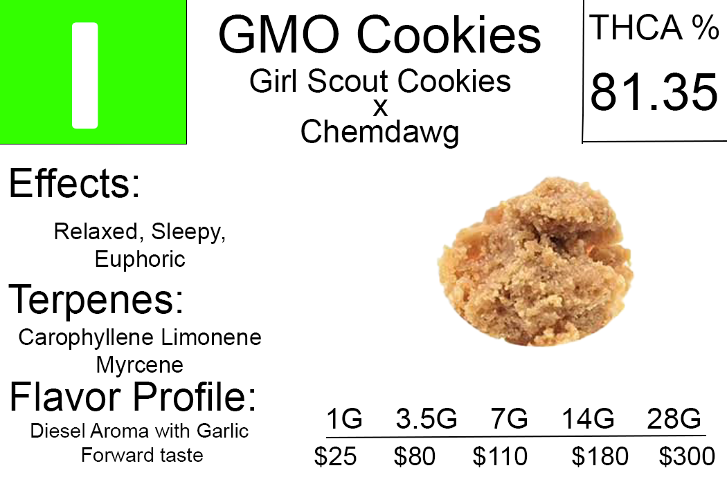 1 gram GMO Cookies THCA Crumble is a potent Indica concentrate with a distinct diesel aroma and garlic flavor, derive