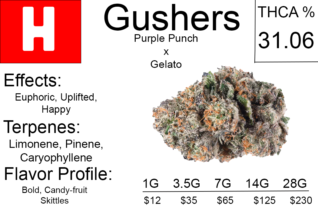 Gushers THCA Flower is a top-shelf, indica dominant hybrid strain derived from Gelato #41 and Triangle Kush, known fo