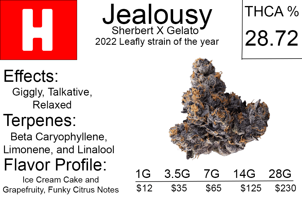 Jealousy Strain THCA Flower, a balanced hybrid crafted by crossing Sherbert Bx1 with Gelato 41.