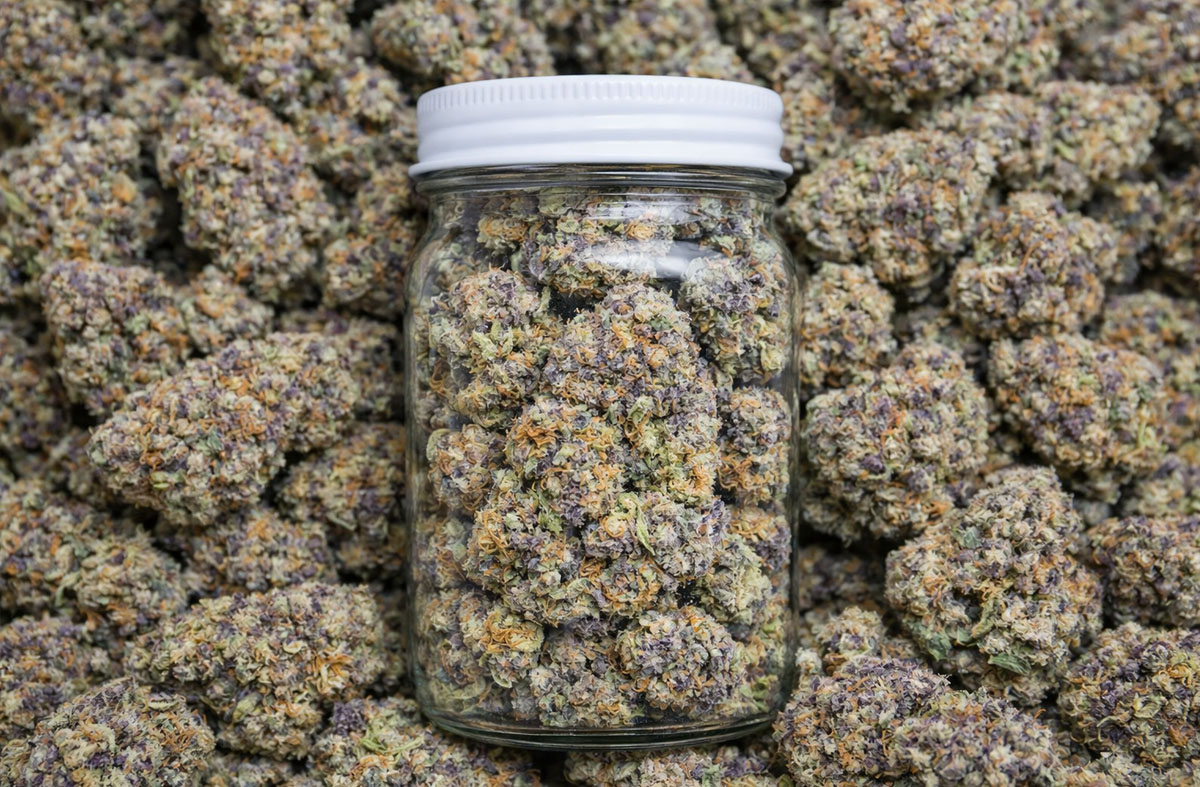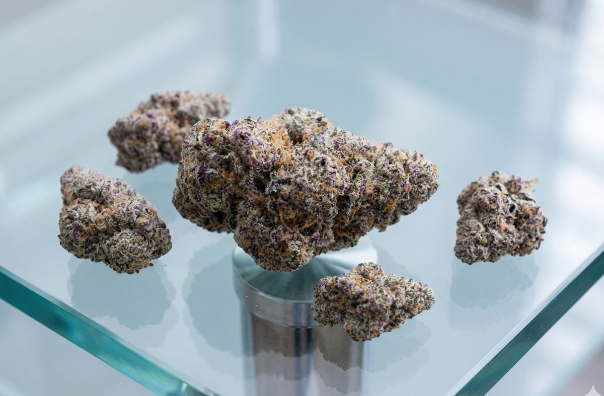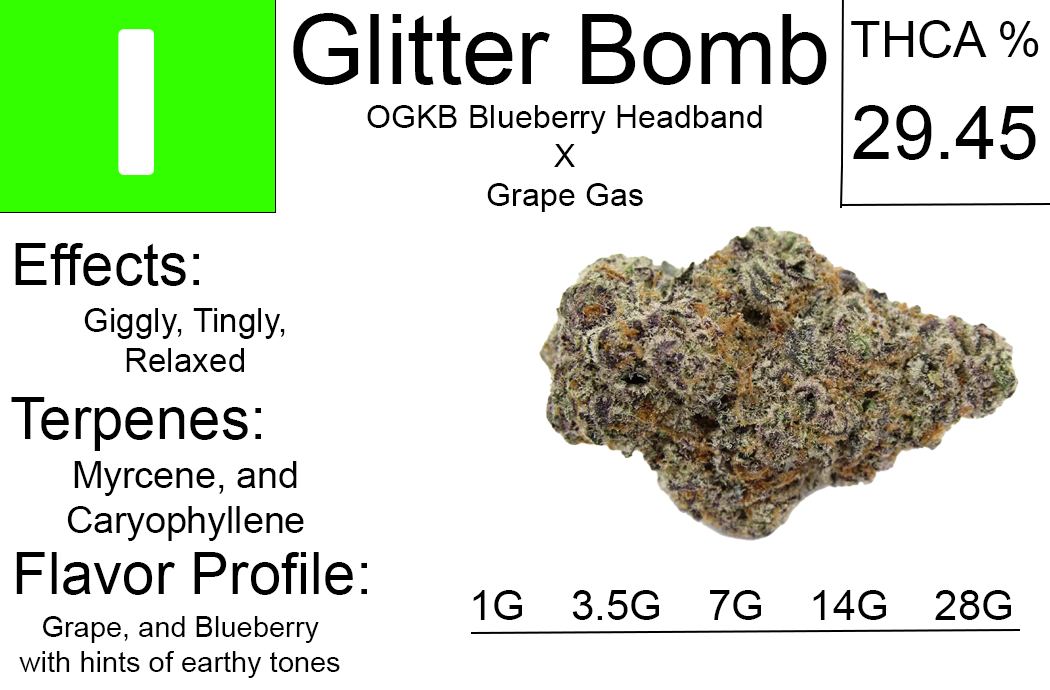 Glitter Bomb THCA Flower is an indica-dominant hybrid created by crossing Grape Gas #10 with OGKB Blueberry Headband.