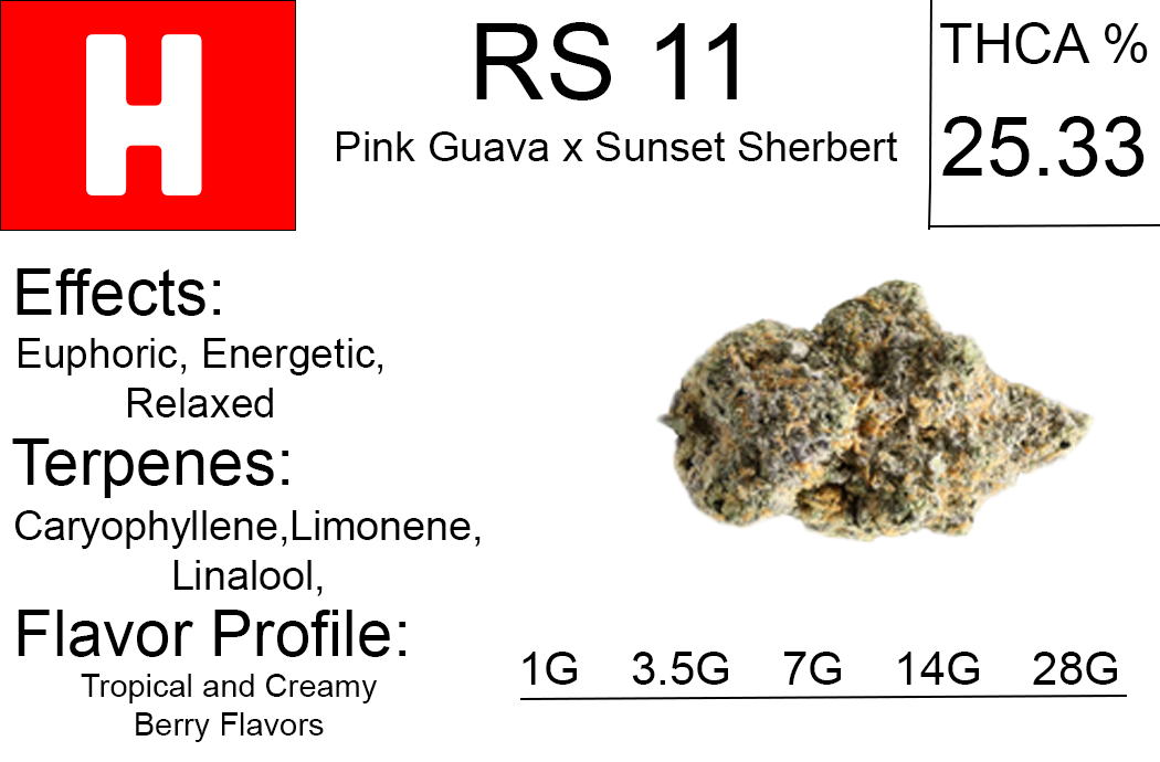 RS11, also known as "RS-11" and "Rainbow Sherbert #11," is a hybrid weed strain that Deo Farms made by crossing the O